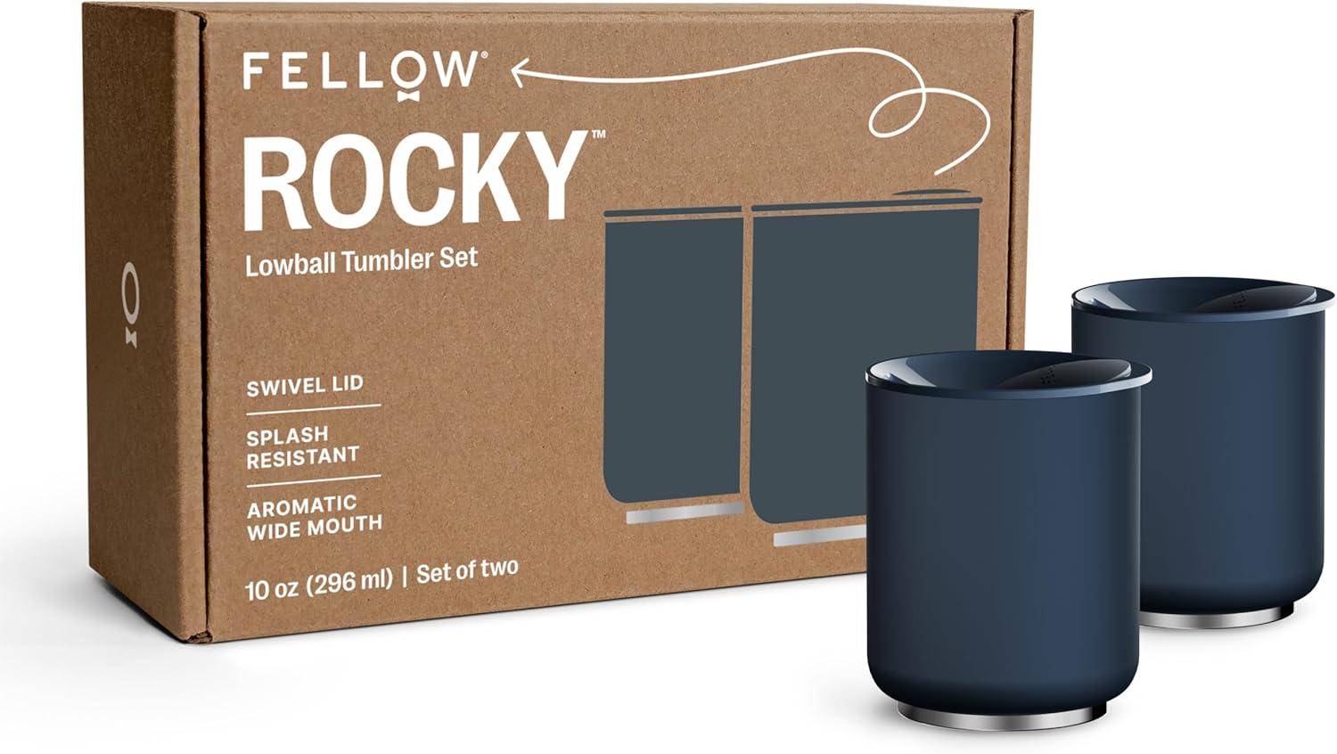 • Fellow 10 oz Rocky Lowball Tumbler – Insulated Stainless Steel Whiskey and Cocktail Tumbler with Ceramic Interior and Swivel Pebble Lid (Matte Black)(Stone Blue)